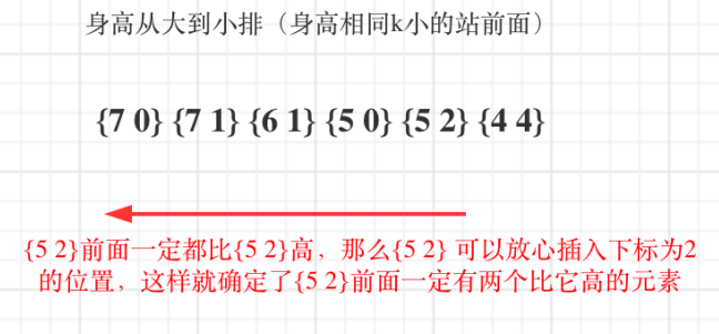 思路:考虑多维度问题,首先确定一个维度。例如这里先确定身高维度(如身高降序),再考虑位序维度,将人插到合适的位置。