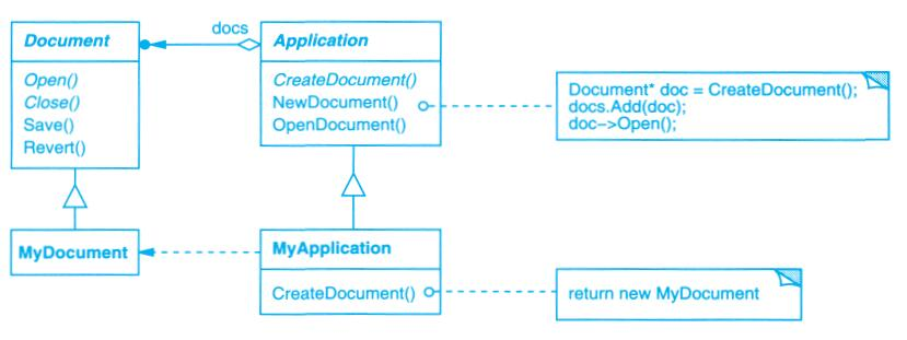 框架用抽象类定义和维护对象之间的关系。 Eg:框架定义了 App 抽象类,它包含一个 Document 抽象内容。但是 App 类无法确认应当实例化哪个 Document 的具象子类: