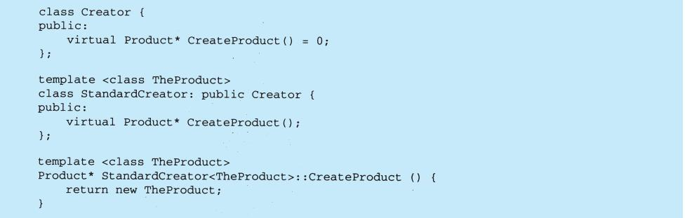 在 C++中另一个解决方法是提供 Creator 的一个模板子类,它使用 Product 类作为模板参数: