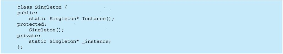 - Singleton:定义一个 Instance 操作,允许客户访问它的唯一实例。Instance 是 一个类操作(即 Java 中的一个类方法和 C++中的一个静态成员函数)。