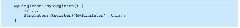 - Singleton 类可以在其构造器中注册自己。例如, MySingleton 子类可以像下面这样做(需要在包含 MySingleton 实现的文件中以静态实例的形式创建该对象,从而调用注册方法):