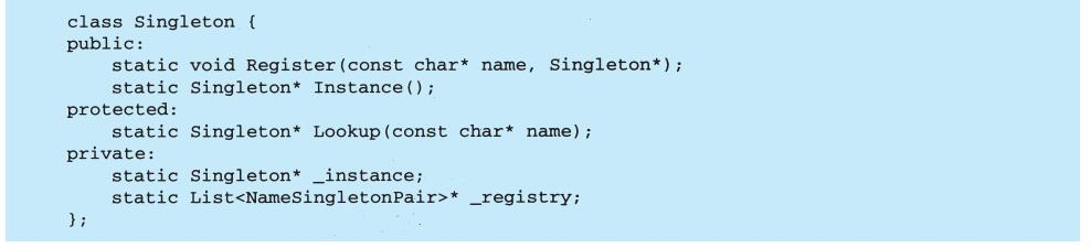 - 使用单件注册表:可能的 Singleton 类的集合不是由 Instance 定义的。Singleton 类可以根据名字在一个众所周知的注册表(存储实例名→单件实例的映射关系)中注册它们的单件实例;收到请求时查询相应的单件(如果存在的话)并返回它。