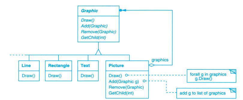 - 聚合类 Picture 定义了一个 Graphic 的集合,它的 Draw 递归调用子部件的 Draw 操作。由于 Picture 接口与 Graphic 接口是一致的,因此 Picture 对象可以递归地组合其他 Picture 对象。
