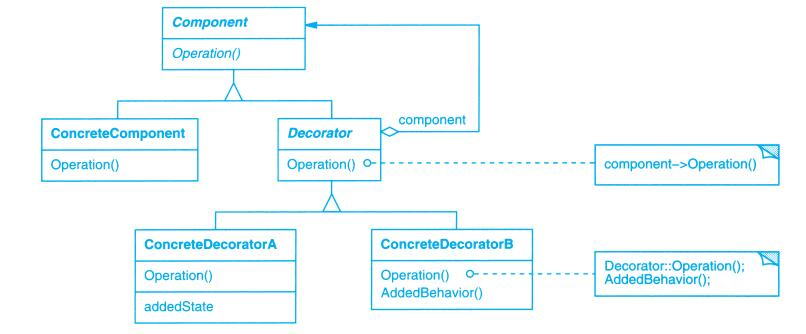 - 这个装饰与它所装饰的组件接口一致,因此它对使用该组件的客户透明(因此可以递归地嵌套)
