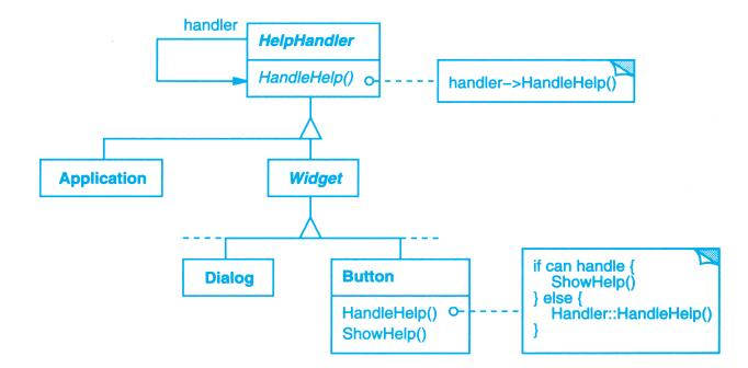 - 问题:提交帮助请求的对象(如按钮)并不明确知道谁是最终提供帮助的对象,需要有一种办法将提交帮助请求的对象与可能提供帮助信息的对象解耦(decouple)