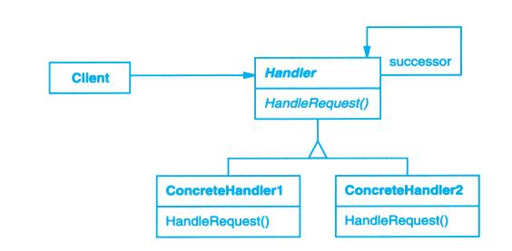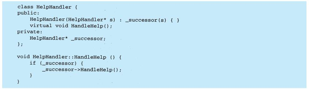 - 由 Handler 实现:如果没有已有的引用可定义一个链,则必须构建新的链。这种情况下 Handler 不仅定义该请求的接口,通常也维护后继者