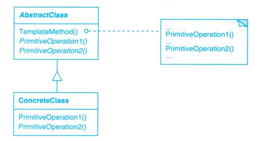 - 实现一个模板方法,定义一个算法的骨架。该模板方法不仅调用原语操作,也调用定义在 AbstractClass 或其他对象中的操作。