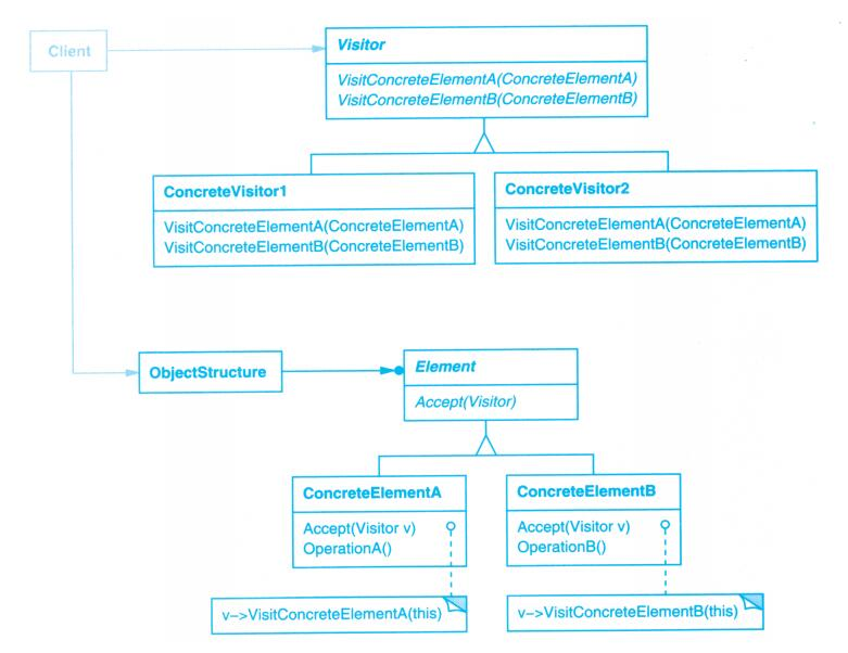 增加新的 ConcreteElement 类很困难:每添加一个新的 ConcreteElement 都要在 Vistor 中添加一个新的抽象操作,并在每一个 ConcretVisitor 类中实现相应的操作。