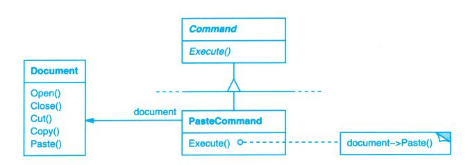 例如,PasteCommand 支持从剪贴板向一个文档(document)粘贴正文。 PasteCommand 的接收者是一个文档对象,该对象是实例化时提供的。Execute 操作将调用该 Document 的 Paste 操作。