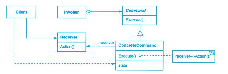 - Command 子类将接收者作为它的一个实例变量,并实现 Execute 操作