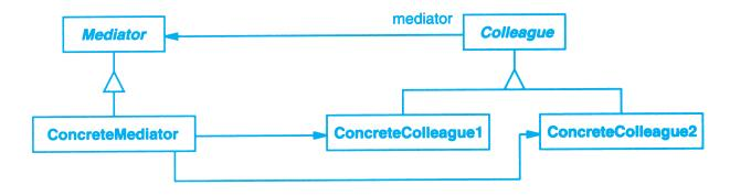- 解决方法:可以通过将集体行为封装在一个单独的中介者(mediator)对象中,如下图所设