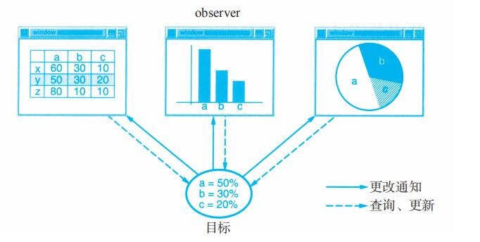 封装复杂的更新语义: 当目标和观察者间的依赖关系特别复杂时,可能需要一个维护这些关系的对象。我们称这样的对象为更改管理器 ChangeManager。 ChangeManager 主要负责三方面工作: - 它将一个目标映射到它的观察者并提供一个接口来维护这个映射。这就不需要由目标来维护对其观察者的引用,反之亦然。 - 它定义一个特定的更新策略。 - 根据一个目标的请求,它更新所有依赖于这个目标的观察者。