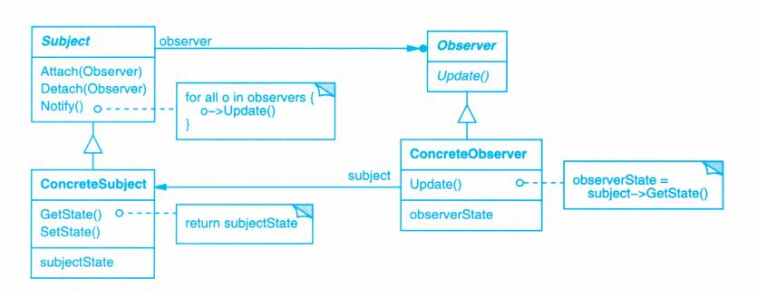 - Observer(观察者):为那些在目标发生改变时需要获得通知的对象定义一个更新接口。