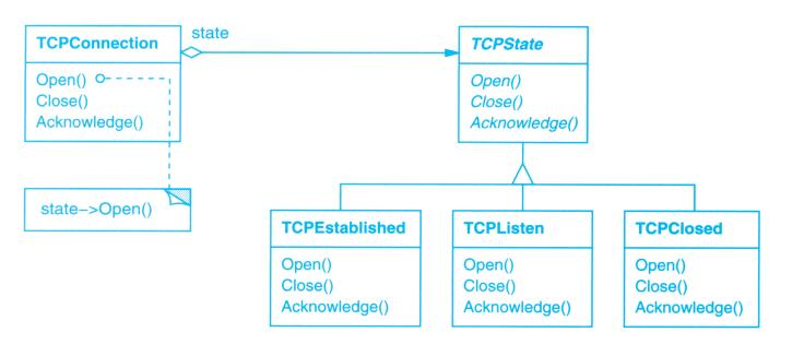 - TCPConnection 类维护一个表示 TCP 连接当前状态的状态对象(TCPState 子类的实例)