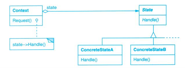 - Context 或 ConcreteState 子类都可决定哪个状态是另外一个的后继者,以及是在何种条件下进行状态转换。